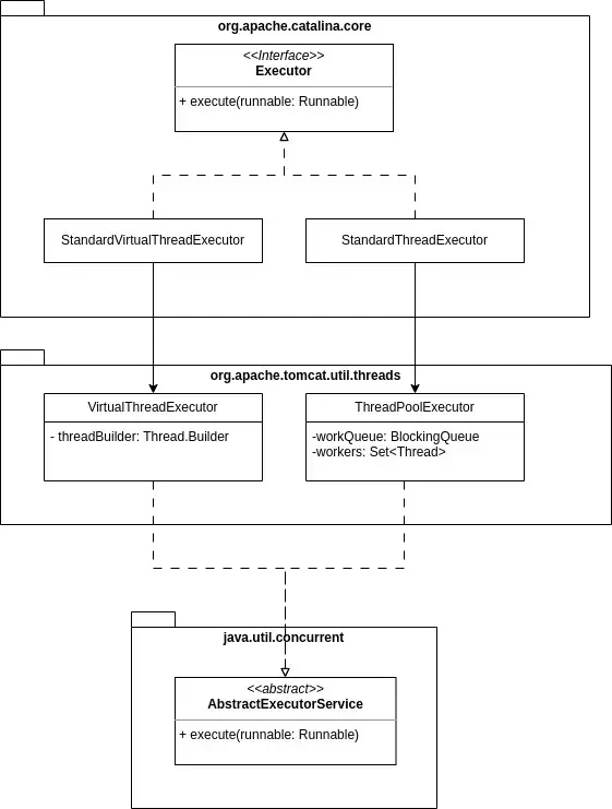 Dans le code de Tomcat, l’interface Executor dĂ©crit les objets qui ont pour responsabilitĂ© d’exĂ©cuter les requĂȘtes entrantes. Depuis la version 10.1 de Tomcat, cette interface a deux implĂ©mentations. L’implĂ©mentation historique StandardThreadExecutor, qui s’appuie sur un pool de Threads workers et une BlockingQueue de taille fixe pour les requĂȘtes entrantes, et la nouvelle implĂ©mentation StandardVirtualThreadExecutor qui utilise un Virtual Thread pour exĂ©cuter chaque requĂȘte entrante.