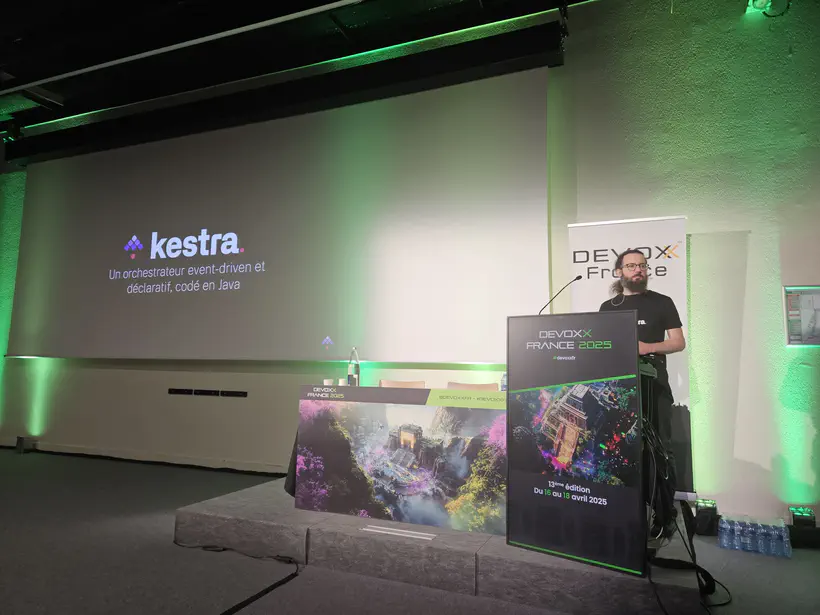 Dans ce lunch talk (15 minutes, ça va vite !), mon pote Loïc a présenté Kestra, son architecture, et a fait une démo d’écriture et d’exécution d’un workflow simple dans l’interface Kestra, et a présenté l’écosystème des plugins Kestra. Il a aussi expliqué les avantages d’avoir choisi Java pour le développement de cet outil, en particulier l’utilisation de Nashorn (qui sera remplacé à terme par GraalVM polyglot), pour exécuter les scripts écrits dans le langage du choix du développeur.