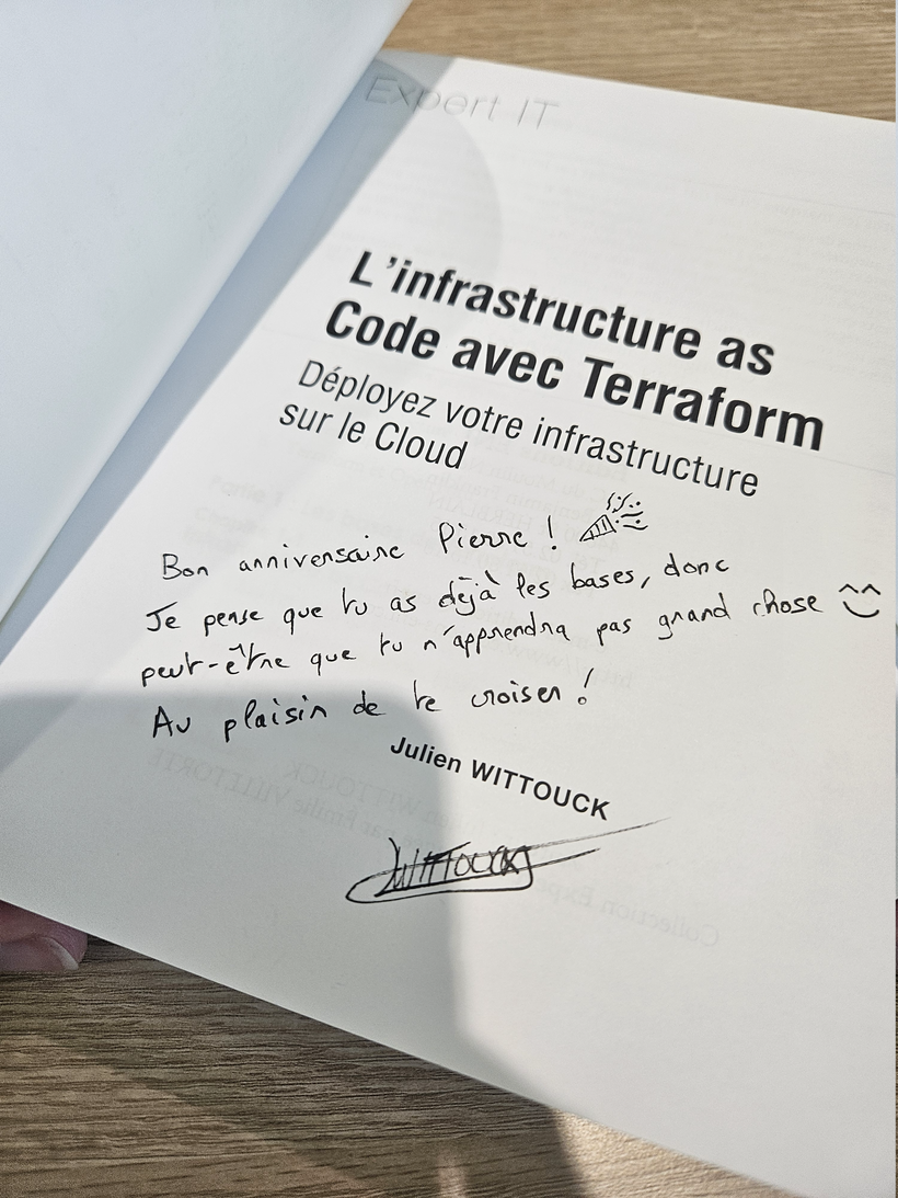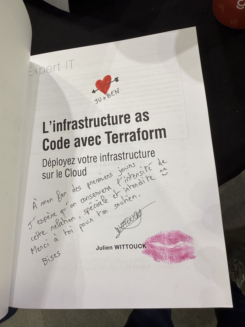 Vous l’avez probablement vu, mon livre “L’infrastructure as Code avec Terraform” est sortie pendant cette saison (le 10 octobre pour être précis). 436 pages dont l’accouchement ont été compliquées. Avec la sortie du livre, ça a été pour moi l’occasion d’en faire la promotion sur mes réseaux et aussi de m’essayer à l’exercice rigolo des dédicaces.