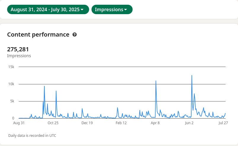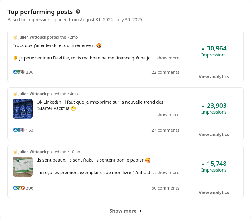 J’ai extrait mes stats LinkedIn pour la rédaction de ce bilan, et je suis plutôt impressionné par le résultat : 275k vues sur la saison.