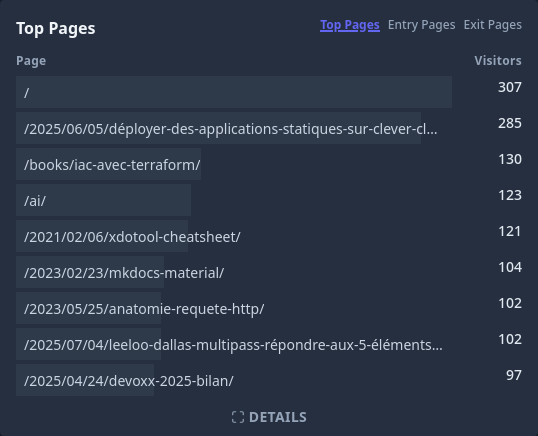 L’article ayant eu le plus de succès est Déployer des applications statiques sur Clever Cloud. Je pense que cela s’explique par le fait que Clever Cloud ait repartagé cet article, ainsi que le pote Denis Germain. C’est aussi un des articles les plus récents, peut-être que mon audience se construit petit à petit.