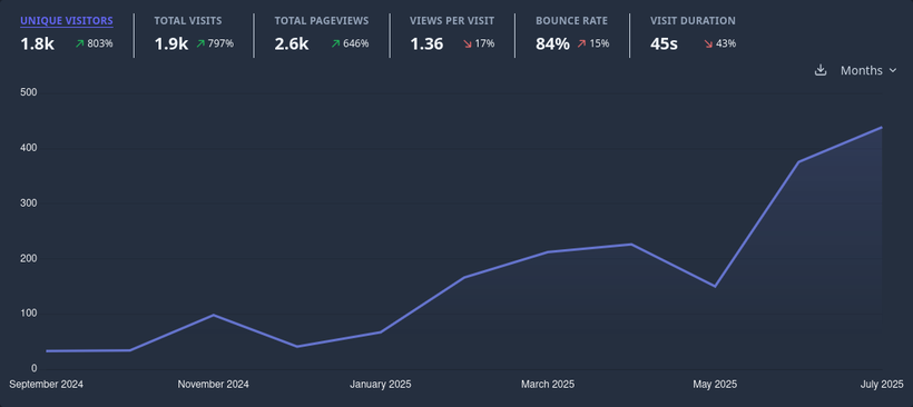 Pour la période du 1er septembre au 1er août, 1800 personnes ont visité codeka.io, pour un total de 2600 pages lues.