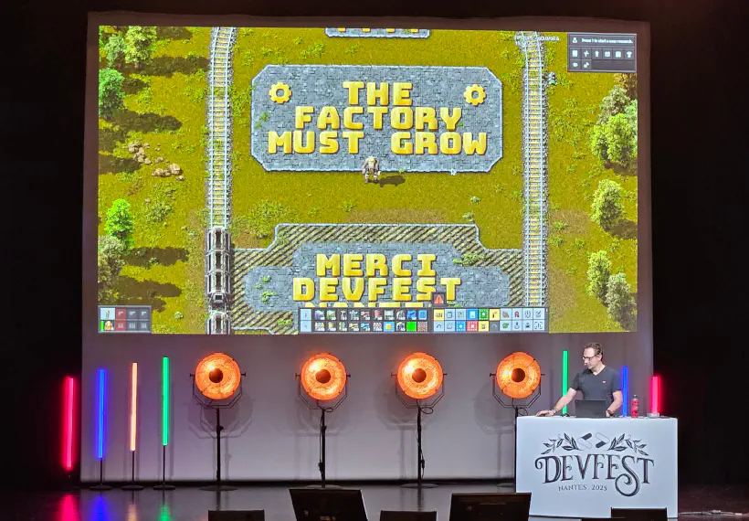 Cette semaine, j’avais la chance d’être au DevFest de Nantes 2025, pour y présenter mon talk “Let’s play Factorio”.
